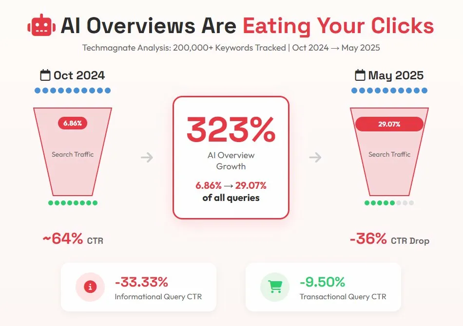 - Overall referral traffic drop of 25% linked directly to AI Overviews