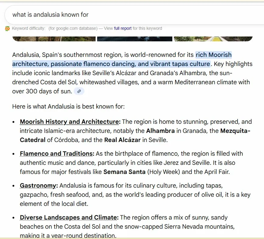 I tested this myself. Searched “what is andalusia known for” and got an AI Overview with bolded phrases like “rich Moorish architecture,” “passionate flamenco dancing,” and “vibrant tapas culture.” Clicked on one of those bolded terms. Where did it take me? Not to a travel blog or Wikipedia. It opened a new Google search.