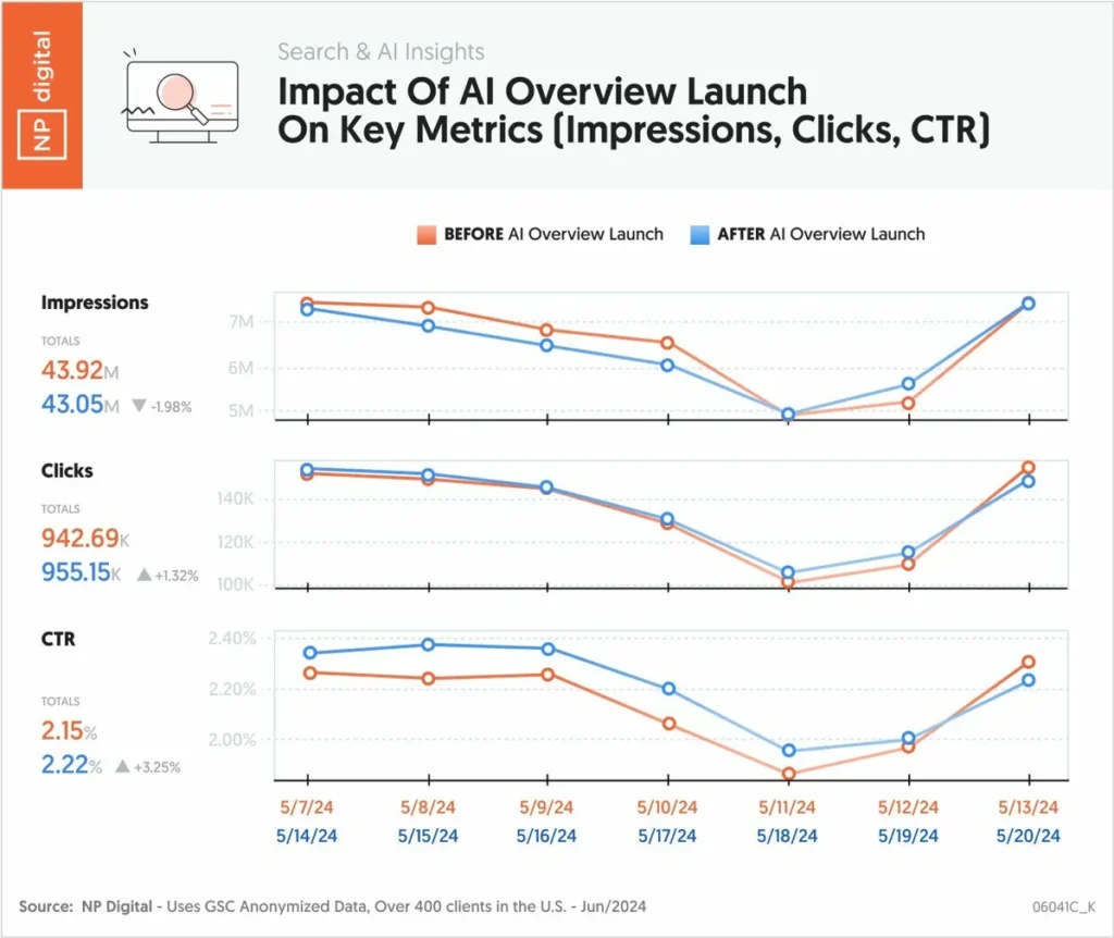 The chart above from NP Digital shows what happened immediately after the AI Overview launch. Notice how clicks and CTR dipped sharply in the weeks following rollout before partially recovering. This pattern repeated across thousands of websites.