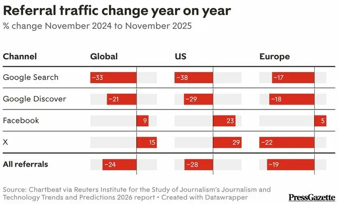 - Publishers expect search traffic to decline another 43% over the next three years (Reuters Institute)