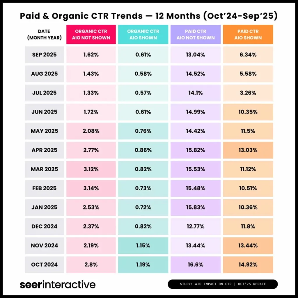 This table breaks down the month-by-month CTR trends from October 2024 through September 2025. The pattern is clear. When AI Overviews appear, CTR craters. The “AIO Shown” columns tell the story.