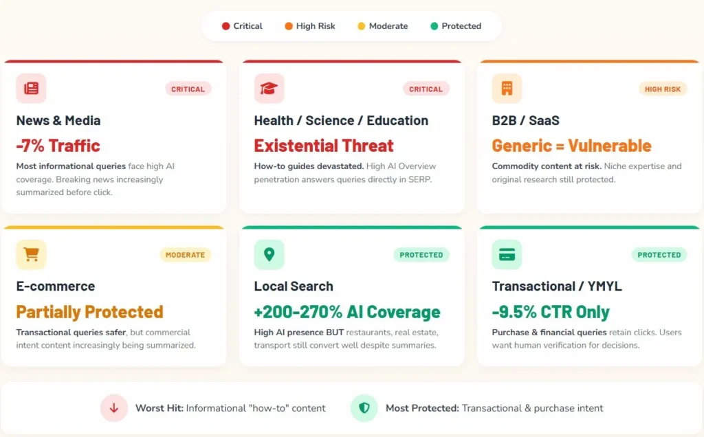 E-commerce and transactional queries are more protected. When someone wants to buy something, they still need to click through to complete the purchase. AI Overview coverage for transactional queries sits around 1% compared to 27%+ for informational queries.