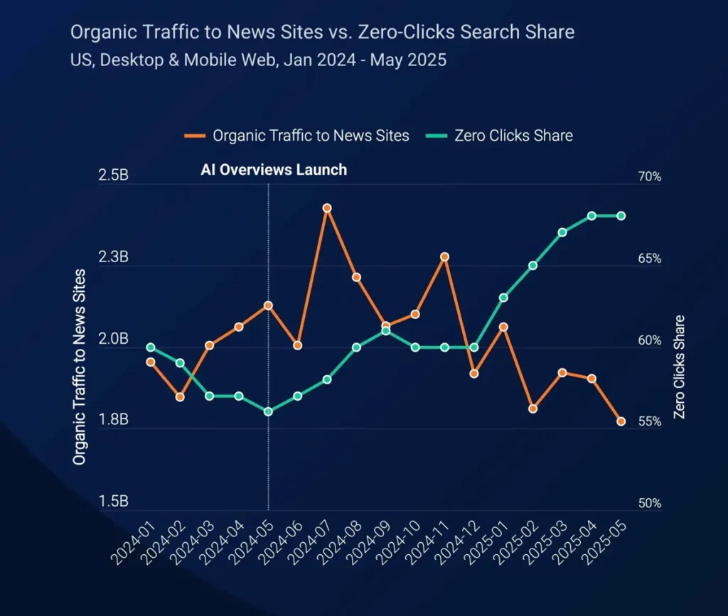 This chart visualizes the relationship between organic traffic and zero-click share. Notice how they move in opposite directions after the AI Overviews launch marker. As zero-click share climbs toward 70%, organic traffic to news sites trends downward.