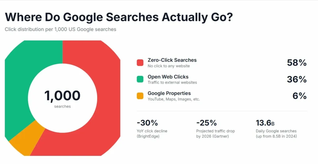 - 58.5% of Google searches in the US now result in zero clicks (SparkToro/Datos 2024 study)